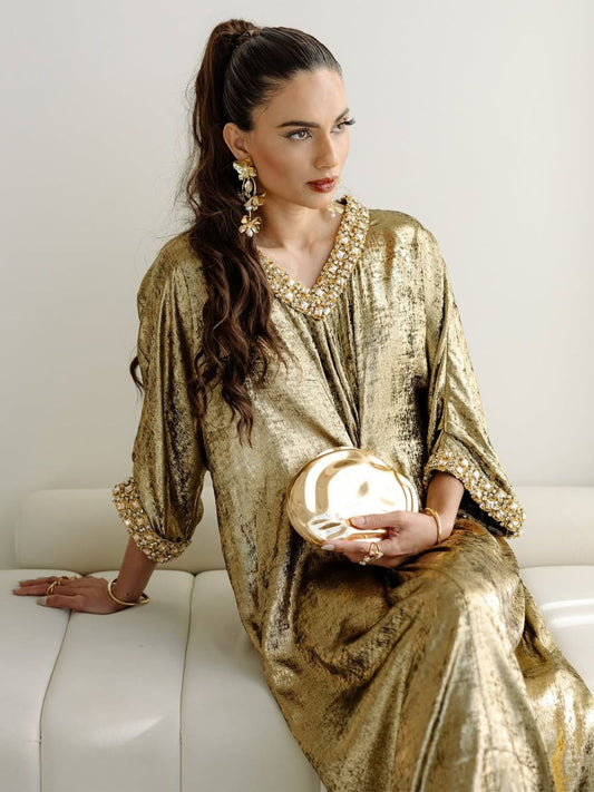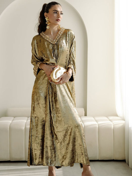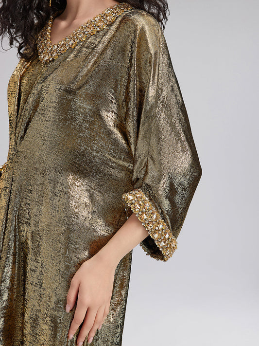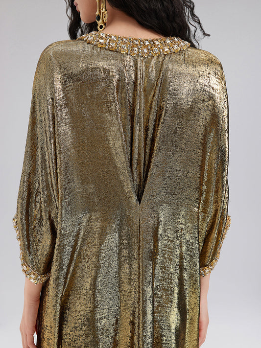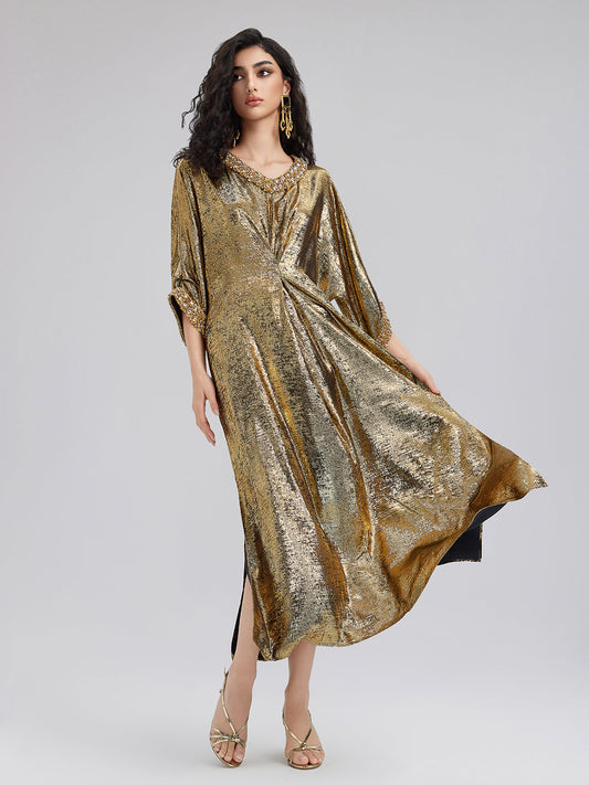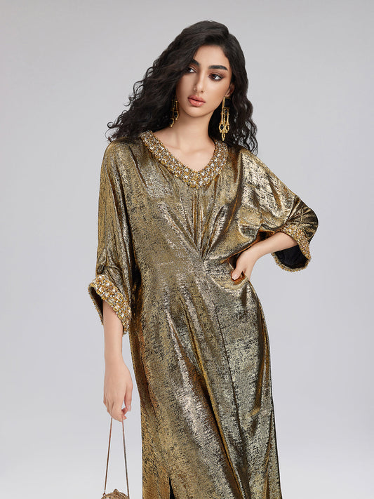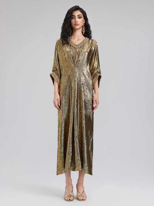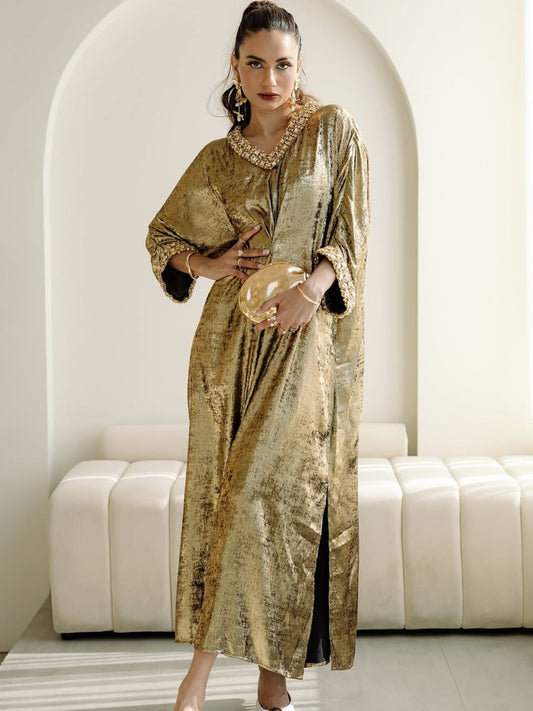 This stunning dress features a luxurious gold fabric with a rich, lustrous shine.The intricate embroidery and embellishments around the V-neck add elegance and sophistication. With a loose, comfortable fit, it suits various body types and offers ease of wear for both casual and semi-formal occasions.