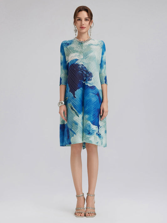 Crafted from finely pleated fabric with excellent elasticity and shape retention, this dress offers comfort and flexibility. Its irregular color block print breaks traditional monotony, showcasing a free, relaxed style. Three-quarter sleeves perfectly reveal slender wrists, paired with a loose fit flattering all body types.