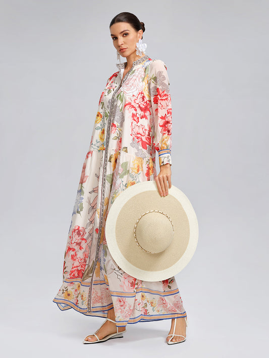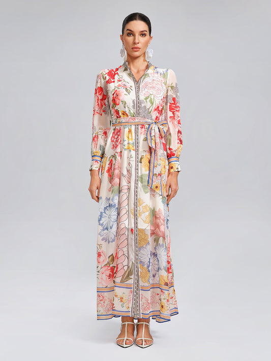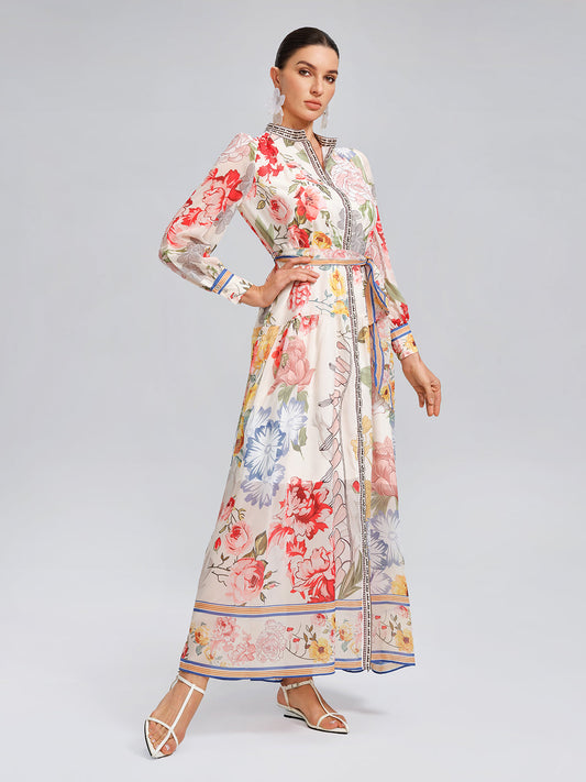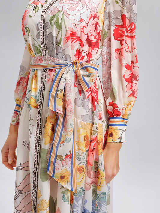 Cut as a high-waisted shirt dress with a belt, this piece sharpens proportions with ease. Multicolored floral prints create a polished yet romantic look, perfect for gatherings, holidays, or weddings.